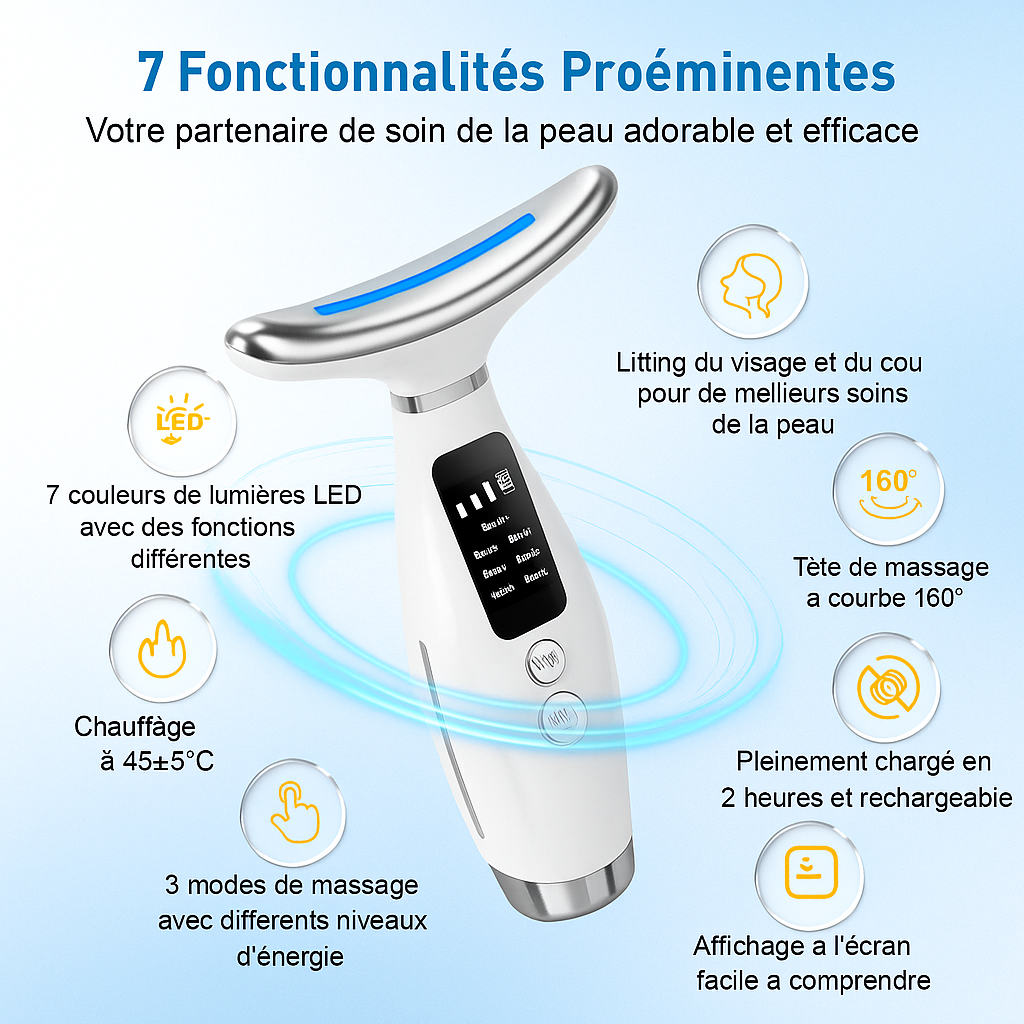 Un geste simple, un effet bluffant Cet appareil raffermit, redessine et atténue les signes de fatigue du visage et du cou. Effet lifting sans chirurgie. Peau plus lisse et éclatante. Adoptez-le et transformez votre routine beauté !